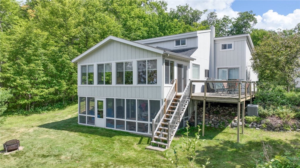 Experience lakeside living at its finest on one of NW Wisconsin’s premier lakes—Round Lake. This beautifully updated home boasts stunning views and is perfect as a main residence or a second getaway. The current owners have thoughtfully upgraded the property with some new flooring, a stylish stairway, granite countertops, some fresh sheetrock, some updated electrical and plumbing, and much more—move-in ready! Enjoy a spacious main-floor master suite with a walk-in closet and private deck access, a roomy galley kitchen with formal dining, and a year-round sunroom. Round Lake offers over 3,000 acres of crystal-clear water with visibility up to 10 feet, sandy beaches, a marina, and endless water activities. The home includes an oversized detached two-car garage, a firepit area, a dock accommodating boats up to 40 feet, ample storage upstairs, and a finished lower level featuring a rec room and office space. Don’t miss the chance to live or vacation in this exceptional lakeside retreat!