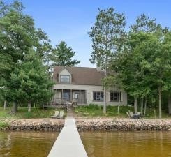 Experience lakefront living in this charming home nestled amongst towering pines. This home offers the perfect blend of rustic charm & features a sandy beach and effortless lake access. Stunning, light-filled living room with a dramatic vaulted ceiling and South-facing windows with breathtaking views. The centerpiece is a magnificent, floor-to-ceiling stone accent wall with wood-burning stove. Spacious kitchen with breakfast bar and dining area. Primary suite with custom built dormer bed. Three bedrooms on one level! The basement has room to add an additional bedroom and family room, there's already a roughed-in fourth bath! This full recreation lake is great for fishing Walleye, Musky, Northern Pike, and Bass! Located near the town of Stone Lake, home of Cranberry Fest, and only 15 minutes from Hayward area lakes, shopping, and snowmobile trails located across the street! The perfect place for families to play, Welcome home!