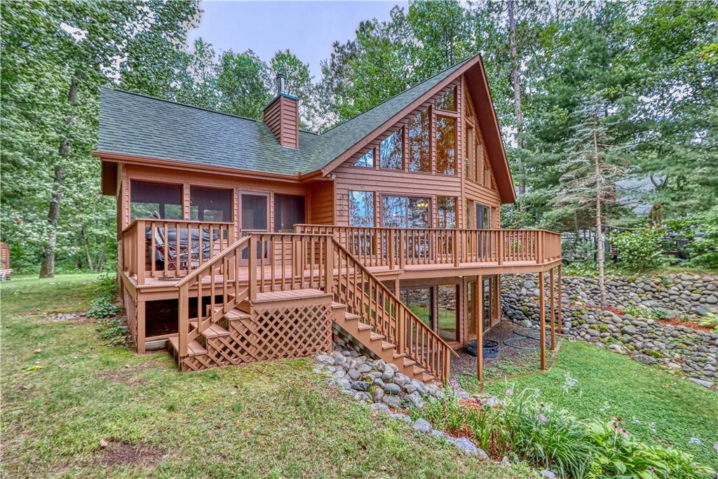 Northerly exposure on this clear-water, full-recreation lake that connects to Lac Courte Oreilles via Grindstone Springs. This meticulously kept updated chalet-style lake home has large windows that flood the main floor w/ light & warmth. The main level is an open concept kitchen/dining/living room. Two bedrooms and a full bathroom round out the main level. The loft consists of a large main bedroom suite with a full bath including a spa tub. Check out the extra bunk space in the lower-level bedroom plus the large rec/game room that walks out to ground level. Enjoy evenings on the large, finished screen porch or take in the views from the expansive lakeside deck. This property is fully furnished! There is room for a detached or attached garage on the property. Grindstone Lake is 3100+ acres with two islands and 10.5 miles of shoreline. Septic is sized for a 3 bedroom.