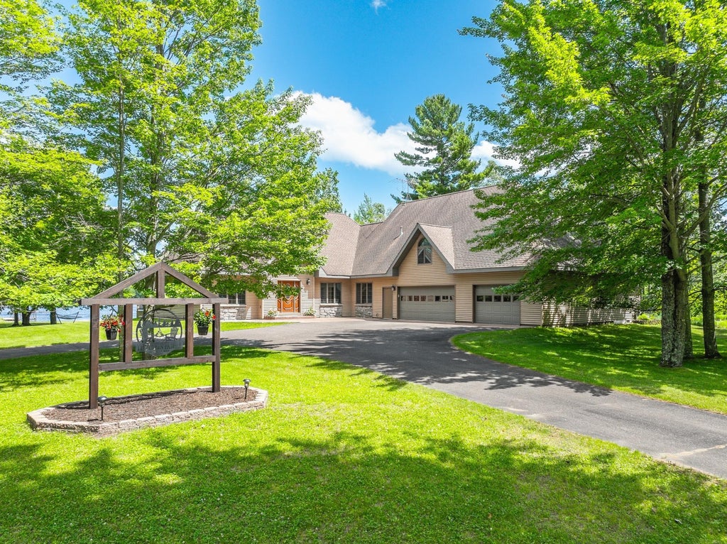 Once in a Lifetime! Luxury Lakefront Living on 65 acres with miles of groomed trails and a SANDY level beachfront peninsula offer panoramic lake views and make this YOUR dream property for both refined living and outdoor adventure! The Grand entry welcomes, and architectural beauty shines throughout with unique angles and expansive, thoughtfully placed windows. There is a 2-sided stone fireplace shared by the living and kitchen areas, with the living room stepping out to the 1,200 sf wrapping lakeside deck. Chef’s kitchen offers warm oak cabinets, island, and coffee bar. There is a dedicated main floor laundry, office, Primary Suite walk in closet, jet tub, and massive guest room/bonus room. The upper level includes sunny loft, two generous bedrooms, full bath with 2 sinks, and spacious family retreat room. Eight course basement and attached and detached garages for boat, ATV/UTV and snowmobile storage, with the trails directly accessible from the property! Northwoods Utopia awaits!
