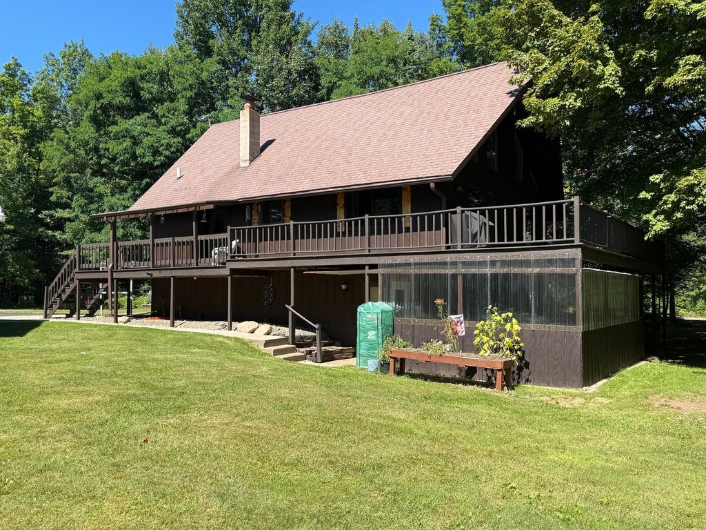 Your Northwoods get-away, this 3 bedroom 2 full bath home sits on a very private wooded lot. But you have deeded access to another lot that borders county land and another lot with deeded access to beautiful Moccasin Lake. All within a 15 minute drive are other popular area lakes and a very competitive 18 Hole Golf Course. This well maintained home has main floor laundry, open concept kitchen, dining and living room with two large patio doors leading to the expansive wrap around deck that gives a wonderful view of the landscaped yard and fruit trees. Outdoor generator for piece of mind so you do not lose electric power. A detached two car plus garage with attached lean-to for additional storage and a Quonset hut to store even more. You can jump right on the ATV and Snowmobile trails from here, The Parrish Hills ATV Trails are right down the road
