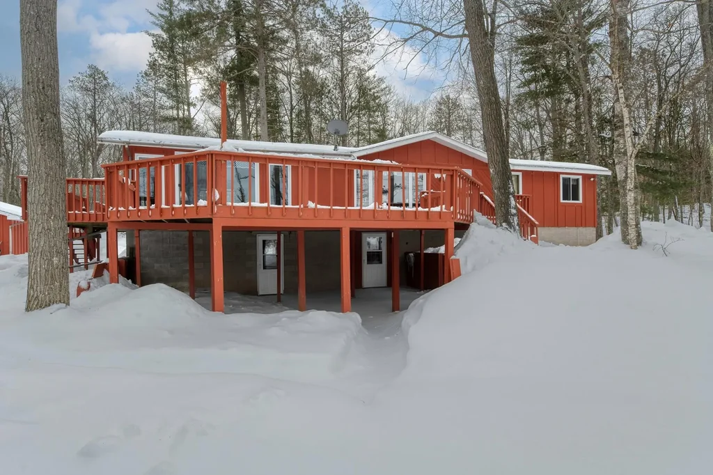 This 3 bedroom, 2 bath ranch offers an easygoing lakefront lifestyle with plenty of room to gather, relax, and enjoy the setting. The main level features a bright family room anchored by a gas fireplace and a full wall of oversized patio doors that frame lake views and open onto the sun deck. A practical kitchen, dining area, and additional living room round out the main floor. The finished lower level expands your living space with multiple walkout points, a second family room, full bath, laundry, and a bonus room perfect for an office or hobby space. Outside, you'll love the level yard leading to 200 feet of frontage on private Lotus Ln, plus a detached 2-car garage, blacktop drive, and more than 4.4 acres to roam, play, and soak in the Northwoods quiet.