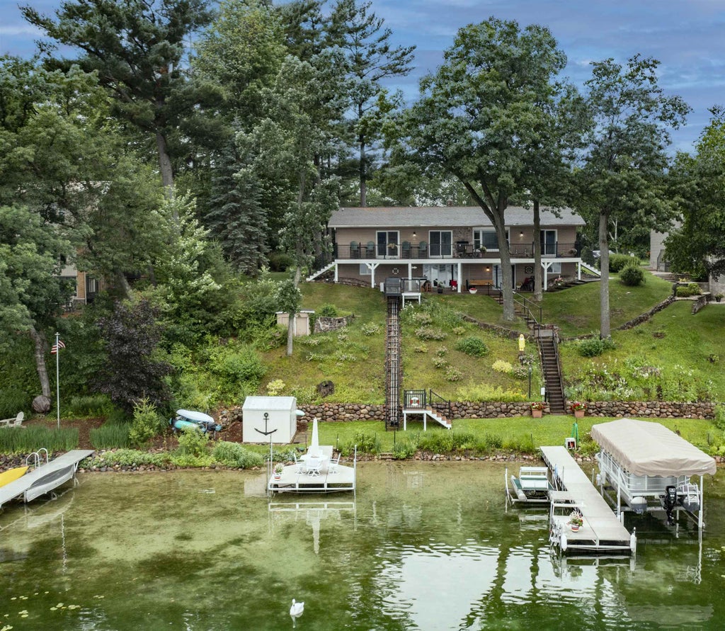 Over 100' of prime sandy frontage on the Waupaca Chain of Lakes with breath taking Sunset Lake views across two lakes. Whether you're relaxing on the updated deck, patio, or one of two private docks, this home defines lake life. Enjoy easy access to the water with kayak storage, lakeside shed, and a new hill side tram system perfect for transporting guests, gear, or coolers. Inside, you'll find a fully remodeled 4-bedroom home with modern finishes, a double-sided fireplace, and gas stove in the walkout lower level. Ideal for hosting guests or large families. The 3-car garage includes a heated/cooled workshop. Nestled on a quiet dead-end road just minutes from town, this lake front gem is a must-see.