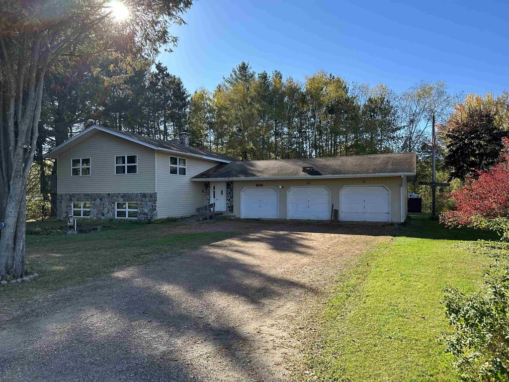 Enjoy the tranquility of the Embarrass River in your backyard with a walking bridge crossing to get the back of the property. This is a bilevel 3 bedroom, 1 1/2 bath home with main level laundry, spacious living room, kitchen/dining with patio door to deck, lower level family room with wood burning fireplace and large 3 stall garage. Carpeting has been removed in an upper level bedroom.
