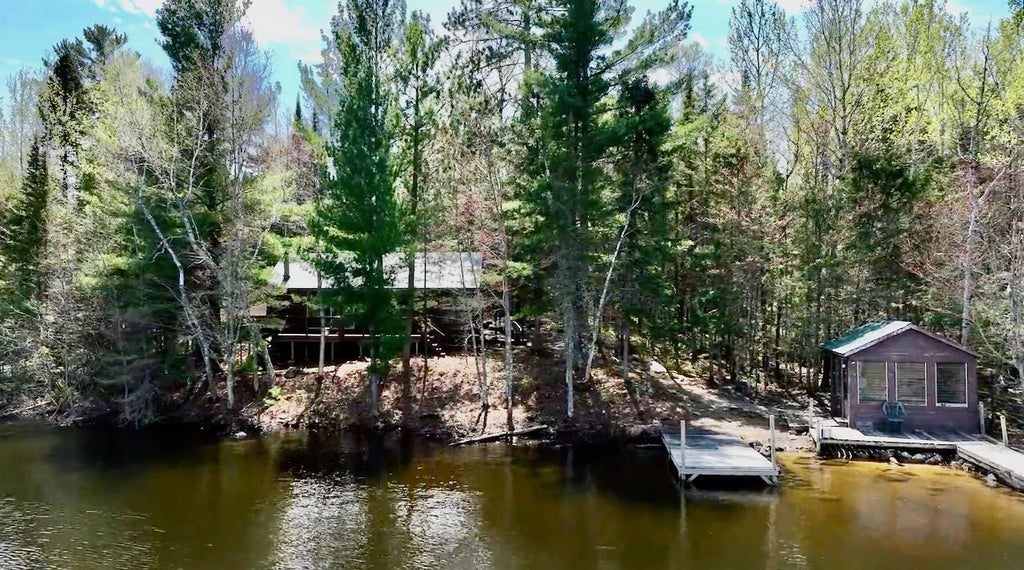 This cozy & well-loved family cabin offers 170 feet of shoreline just minutes from Timbuktu Marina. Nestled on 1.4 acres of mature woods, the property provides a rare mix of privacy, tranquility, & easy access to the water. The main cabin features an updated kitchen, inviting family room with wood burning fireplace, porch for games, dining area, laundry, bathroom, & a comfortable 1-bedroom layout—perfect for peaceful mornings & relaxing evenings. A separate 400 SF guest cabin includes 2 additional bedrooms, BA ,& kitchen area making it ideal for guests or extended family stays. Enjoy lazy afternoons napping, reading, or playing games in your lakeshore cabin, full of cherished memories & ready for many more. With a full septic system, this property offers both comfort & convenience in a natural setting. Whether you're looking for a summer getaway or a place to build lifelong memories, this is the one. Cabin is being sold mostly furnished AND HIGH SPEED INTERNET! See exclusion list.