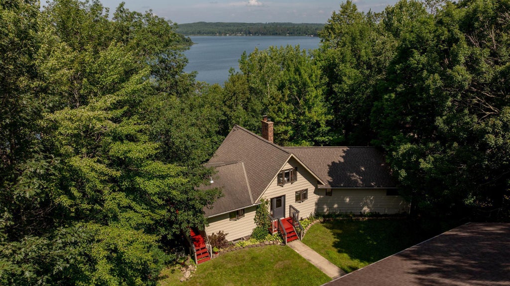 Here's your chance to get your piece of the up-north dream which includes 100 feet of nice sand gravel lake bottom. Sit on the large wrap around deck with family and friends and enjoy spectacular views of Mitchell Lake. This home includes most of the furnishings and features an open floor plan, large kitchen with breakfast bar, stainless steel appliances, gas stove with hood vent, walk in pantry, 2 stone woodburning fireplaces, vaulted knotty pine ceilings, expansive windows in the great room, a cozy loft, 3 bathrooms, finished lower level with a family room and den. The basement den does not have an egress window. The main floor primary suite with a walk in closet, private bath with double sink vanity, jetted tub, and separate shower. Mitchell Lake is known for great fishing, and scenic beauty.