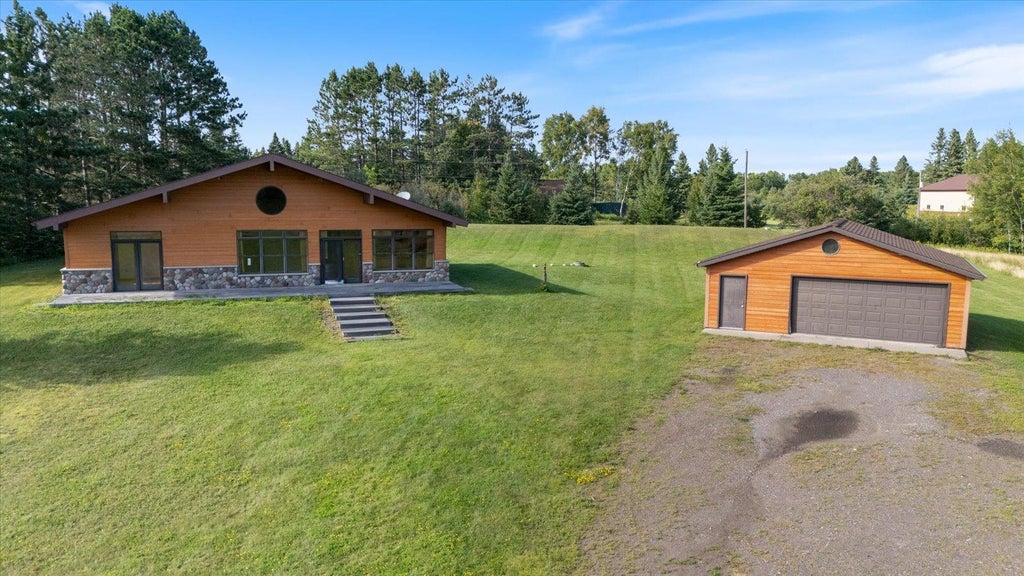 Built in 2003, this one-level home offers 1,666 square feet with 3 bedrooms and 2 bathrooms. Features include vaulted ceilings with exposed beams, in-floor heat and kitchen with center island, dining area, and living room. One bedroom has double closets and a private bathroom. The property includes 2 car detached garage and approximately 8 acres of land with 225 feet of frontage on Crooked Lake.