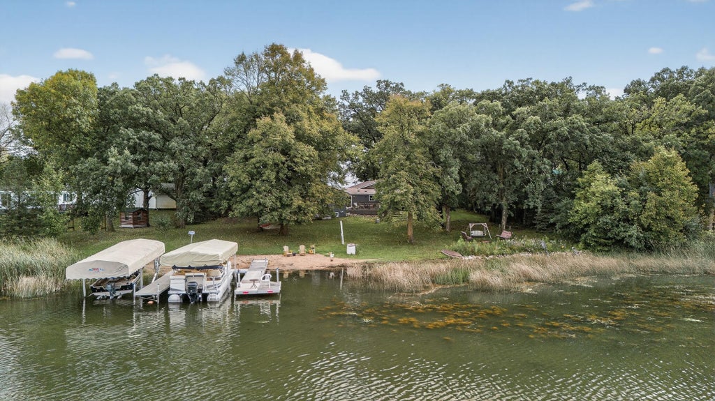 Settle into lakeside living on Pelican Lake with this beautiful one level home and it's gradual walk down to the water. The vaulted knotty pine ceiling bring warmth to the open living room, dining, kitchen, and sunroom, where a gas fireplace adds an inviting touch. The gourmet kitchen features custom cabinets, granite counters, stainless appliances, slate backsplash, and an island that's perfect for gathering. The primary suite offers a walk-in closet and a spa-like bath with rain shower, sauna, and jetted tub, while the separate half bath adds convenience. A craft room doubles as a non-conforming bedroom, and the heated, finished garage makes every season easier. Outside, enjoy the composite deck, mature oaks, 150 feet of shoreline, and included dock. There's an additional detached heated/cooled room, and a 48x31 pole barn with concrete floor and covered overhang-ideal for storage, home-based business, hobbies, or lake toys.
